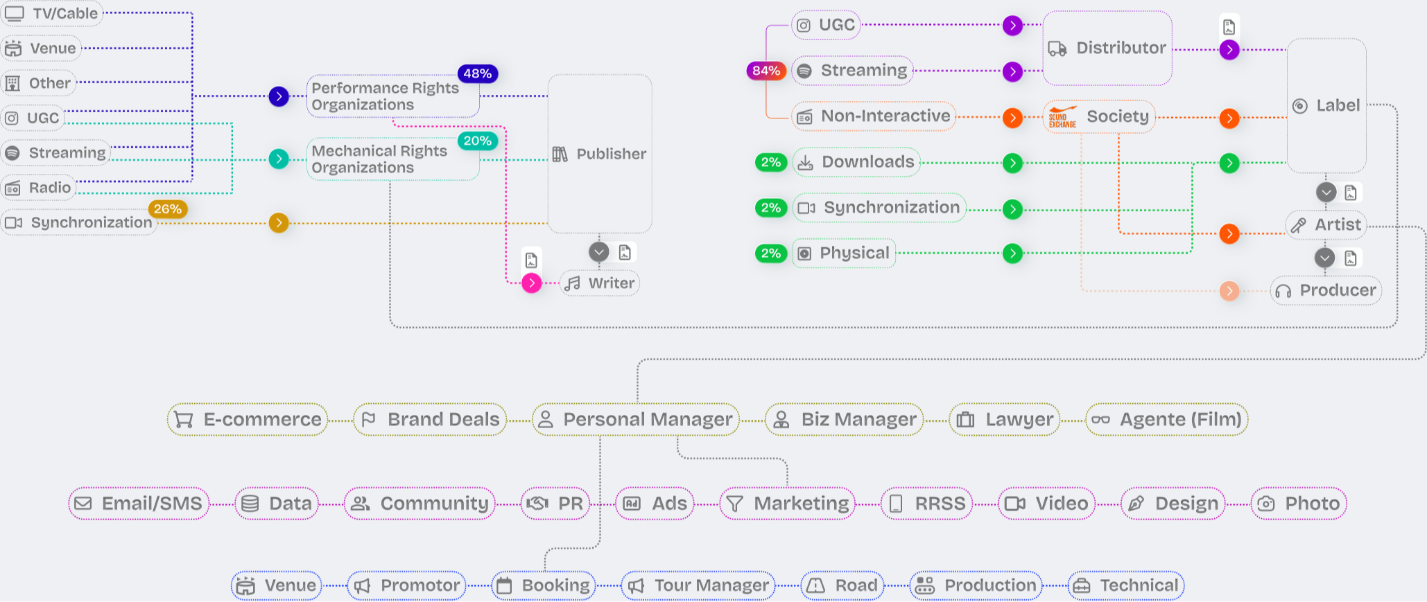Con nuestro primer pilar, aprenderás a navegar la nueva industria musical de forma segura y sus estructuras, roles, contratos y negocio.