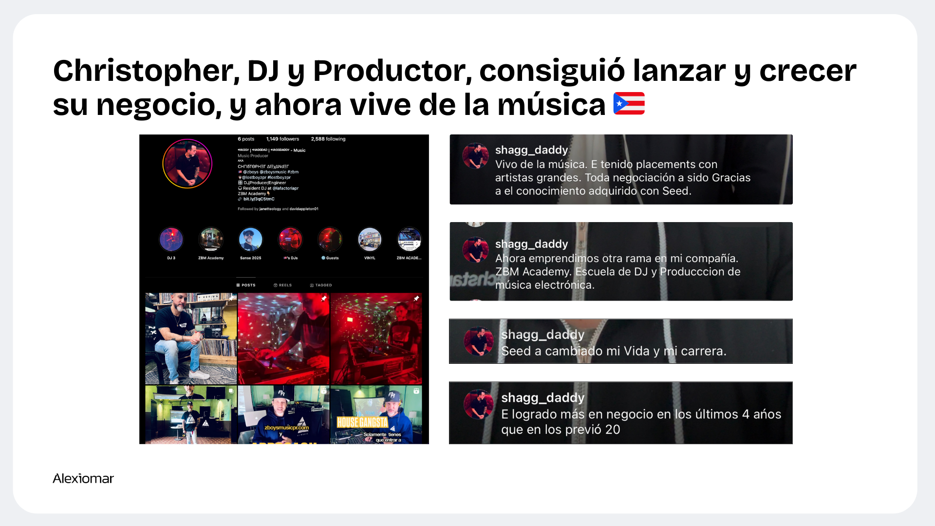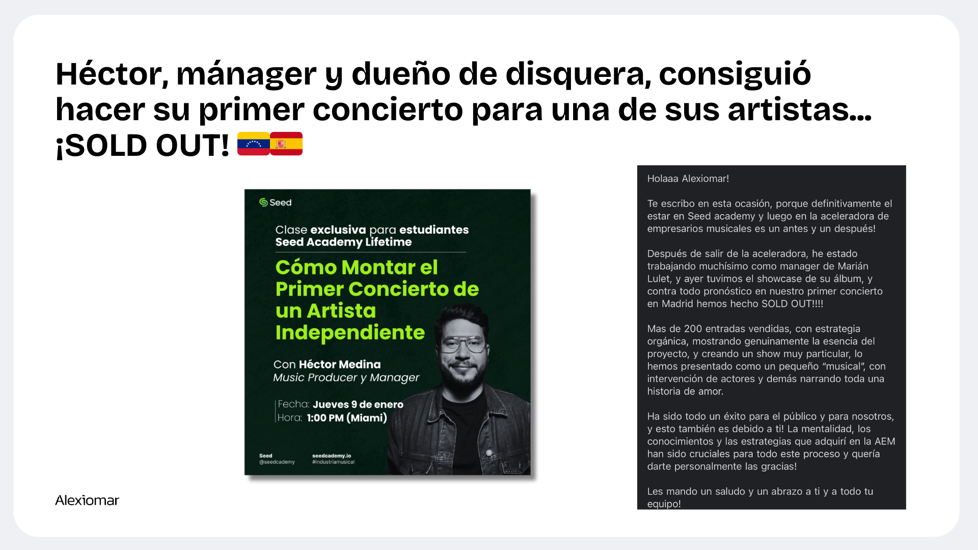 Semilla Co. d/b/a Seed Academy es una plataforma educativa sobre el negocio de la música. Este sitio no es parte del sitio web de Facebook ni de Facebook Inc. Además, este sitio NO está respaldado por Facebook de ninguna manera. FACEBOOK es una marca registrada de Facebook, Inc. La información de este sitio web no debe interpretarse ni utilizarse como asesoramiento u opinión legal para ningún hecho o circunstancia específica. El contenido fue preparado por Semilla Co. Este sitio web está diseñado solo para fines de entretenimiento, educación, e información. Consumir este sitio web no crea una relación abogado-cliente con el Lcdo. Alexiomar D. Rodríguez-López. Usted no debe actuar a base de ni confiar en información alguna sin antes consultar con su abogado o asesor legal. Alexiomar D. Rodríguez-López tiene licencia para practicar únicamente en y desde Puerto Rico.